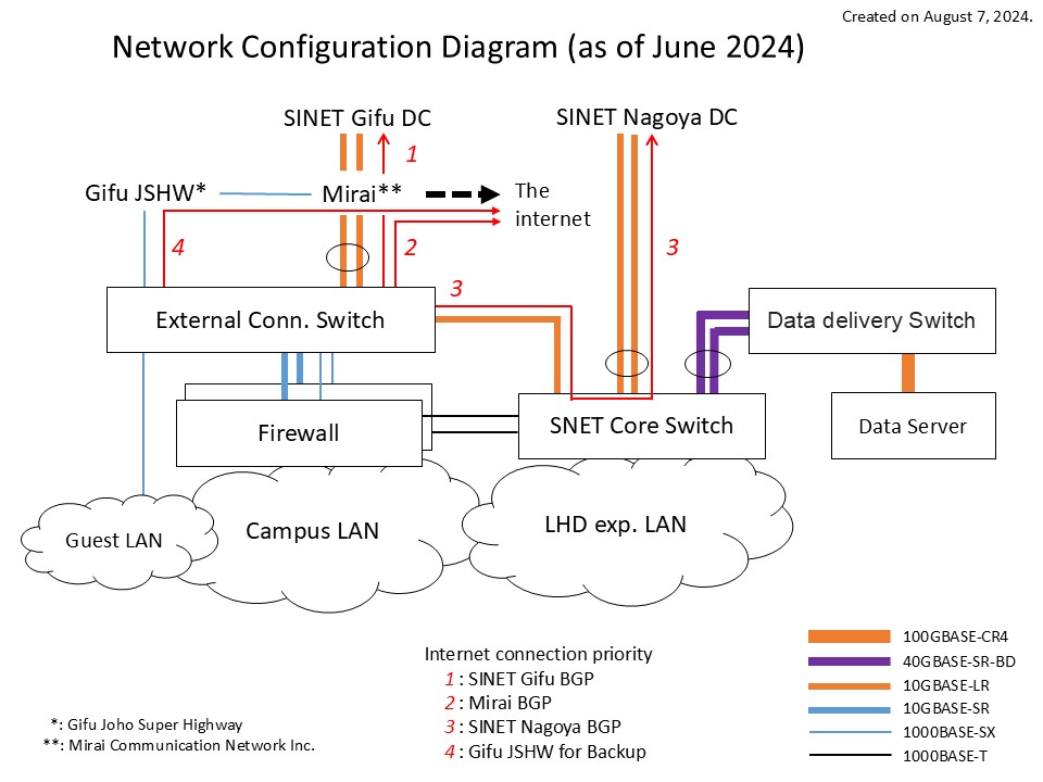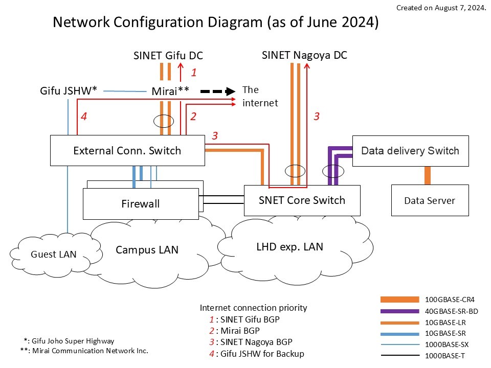 Yamamoto: Yes, the amount of experimental data collected is increasing year by year, and it has been growing at a 100-fold pace in the past decade, which has highlighted the importance of network environment once again. Currently, we have two 10 Gbps connections from Gifu DC to the campus LAN through a firewall via a provider. From Nagoya DC, we connect with SINET’s L2/L3 VPN. When transferring data to AWS, we connected via Nagoya DC using SINET’s cloud connection service. As shown in the network configuration diagram, network redundancy, which also is a SINET feature, allows us to build a backup environment so that communications are not interrupted even in case of maintenance work or failure. Furthermore, we are considering reinforcing Nagoya DC since there is a concentration of VLANs for experiments from there.